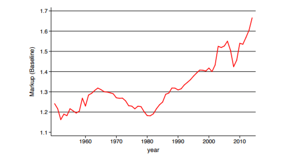 This chart is the main result of the paper. It shows markups (the ratio between cost of inputs and how much a product sells for). From about 1950 until 1980 markups were relatively flat. After 1980 they started to rise, and have continued to rise ever since. They have risen from 18% over marginal cost in 1980 to 67% today.