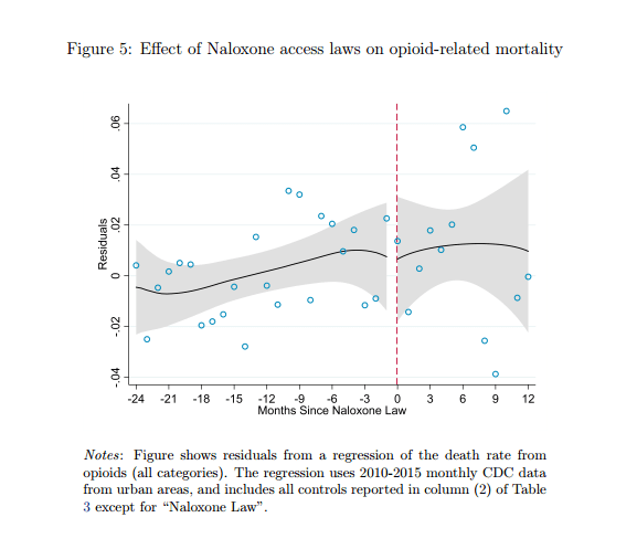 A note, prior to checking, this is not a study on how people react when Naloxone is available, this is a study one how people react when laws that attempt to make Naloxone easier to acquire are passed. These laws might provide legal immunity to prescribers of Naloxone, laypersons who administer the drug, or laws that allow the purchase of Naloxone without a prescription from the doctor. If the laws don’t work as intended, no one gets Naloxone, the measured impact should be closer to zero.